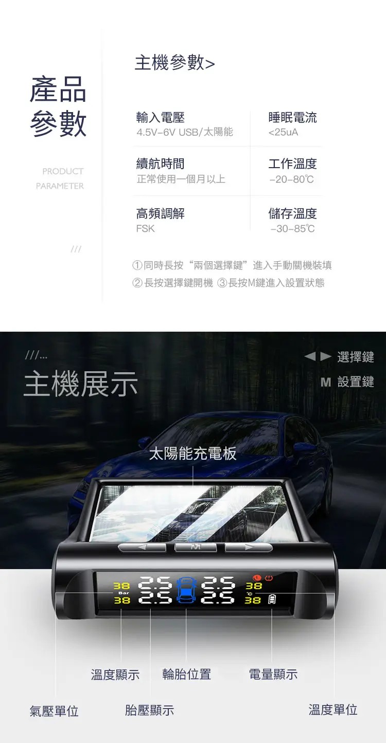 12分鐘前【官方站】太陽能無線胎壓監測器 輪胎盡在掌控!【太陽能 胎壓監測器】漏氣警報,胎壓警報,胎溫警報【太陽能電光板】無需佈線,可任意擺放!適用於所有輪胎,安裝超簡單,一看就會! - 【太陽能 胎壓監測器】