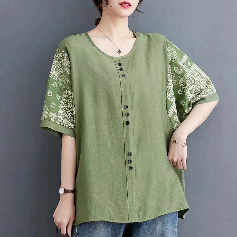 半小時前夏季新款棉麻短袖t卹女款寬鬆大尺碼胖mm印花拼接媽媽五分袖純棉上衣 - 買二送二! 僅售 NT$ 1498